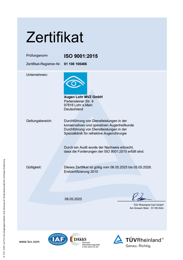 Das AUGEN LOHR MVZ sowie das Augen-Laser-Zentrum Lohr sind nach DIN ISO 9001 : 2015 durch den TÜV Rheinland zertifiziert.